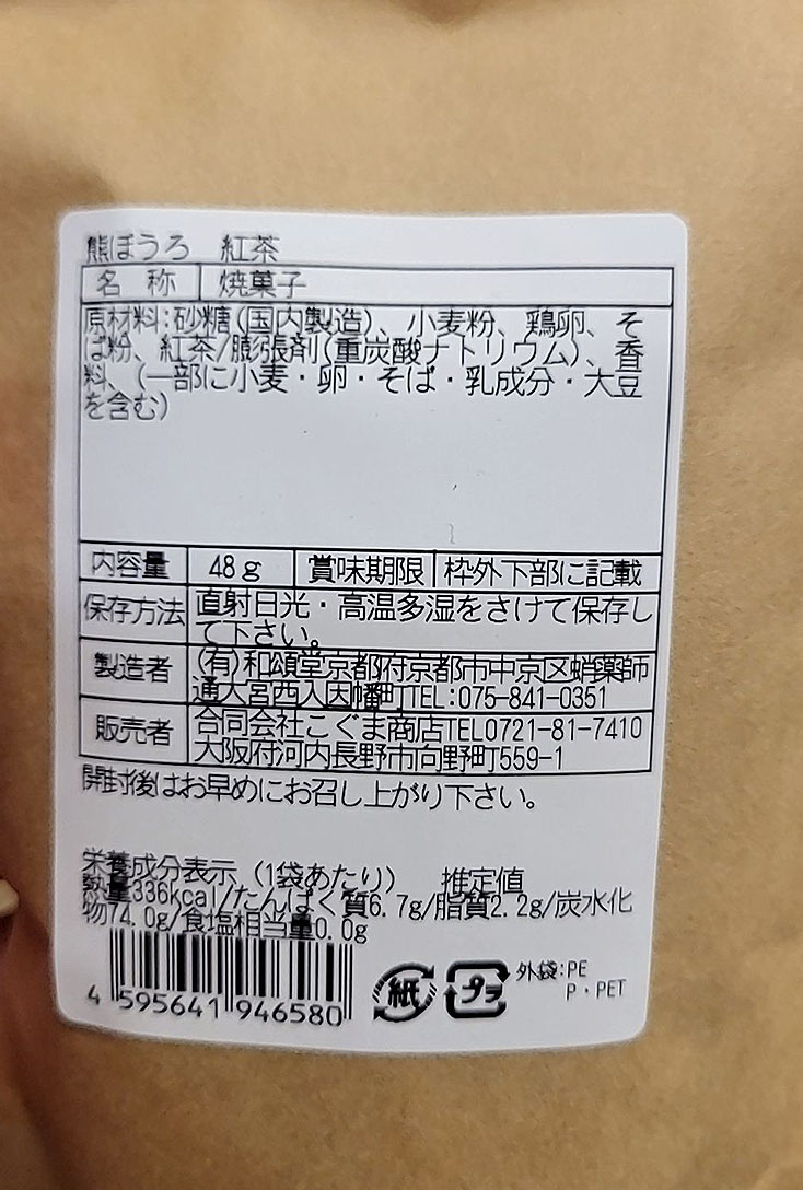 原材料名:砂糖(国内製造)、小麦粉、鶏卵、そば粉、紅茶/膨張剤(重炭酸ナトリウム)、香料 ※一部に小麦・卵・そば・乳成分・大豆を含む
